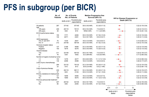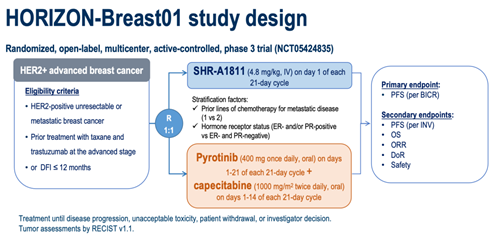 本次大会,研究者报告了Ⅲ期HORIZON-Breast01研究(瑞康曲妥珠单抗 vs 吡咯替尼+卡培他滨治疗曲妥珠单抗和紫杉烷经治的HER2阳性晚期乳腺癌)期中分析的主要统计分析结果。